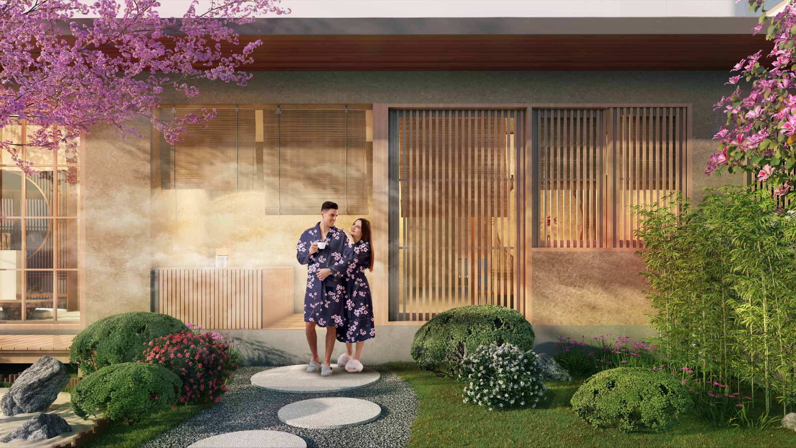 Trong đó, Tổ hợp biệt thự khoáng nóng đẳng cấp với gần 500 căn biệt thự nghỉ dưỡng được giới thiệu ra thị trường đầu tiên. Đây cũng là nơi văn hóa tắm onsen chuẩn Nhật Bản được phát lộ tối đa với nguồn khoáng nóng dẫn vào từng căn biệt thự. Tùy từng loại villa, chủ nhân sẽ được thừa hưởng các tiện ích như: bể ngâm khoáng nóng, phòng xông nóng, xông lạnh, bể onsen ngoài trời, vườn thiền và hồ cá… Để đảm bảo nhiệt độ phù hợp với thời tiết và sở thích của chủ nhân, biệt thự được bố trí phòng máy nhằm cung cấp nhiệt độ riêng theo nhu cầu.